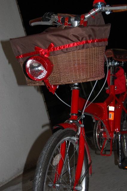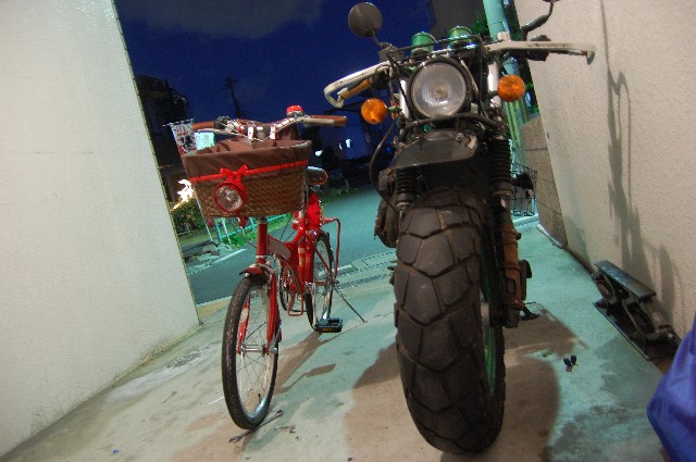 なんだかすっきりしないまま、仕事初め。 正月ボケも消え去り、ようやく一息ついたって感じの 太郎坊ですノシ あけましてオメデトウ御座います。 全国に8506人はいろうかというバンコロ乗りの皆様、 今年も太足倶楽部を宜しく御願いします。 大分過疎化が進んでる当サイトですがw、俺のバンバン愛は相変わらず 沸々と燃え滾っております。 今年はとうとう走行距離10万キロ突破するしね。 まだバン子で走りたい所は山ほどあるしね。 去年やらんかったバン☆カスもやりたいし、バン☆オフもそろそろ2桁人数の大台に 乗せたいしね。 とりあえずけっぱれ俺。超ケッパレ。 え~まぁ、それよりも前に、去年のネタを消化する事から新年は 初めていきましょうwww まずは、12月頭辺りかな? 折り畳み自転車を買ってね。 今流行のミニベロとかじゃない、無メーカのよくある折り畳み自転車なんだけども。 ノーマルで割りと可愛い雰囲気やったんで、これをさらに可愛く実用的にする方向で ちょこちょこと弄りました。方向性は俺のバン子と全く一緒ですw では、割と理想的な感じになった、マイ自転車、名前は「蘭蘭(ランラン)」です!w バン子を出すほどじゃない短距離で使いまくってますよ、ええ。 一番のお気に入り、フロントのカゴ。 藤カゴにブラウンのカゴカバーを被せ、 車体カラーの赤色ステッチ&同じく赤いリボンで纏める。 ちょっと恥かしい位に女子仕様ですw 真正面にボールみたいなwバッテリーライトを設置。 イタリアンレッドに自家塗装済。 ダイナモライとか今時の小型LEDライトとかじゃなくて、 古めかしい大きなバッテリライトにしたのが 俺的こだわり。 小さくて軽くて便利なのが全てじゃないと思うんです。 ダークブラウンのウッドグリップ。 クラシカルスタイルにはこれは外せません。 左右で¥5000という俺のバイクのの2倍もしやがるw ベルは可愛い感じの赤いベルをゲッツ。 「赤いベル」って響きがすでにいい感じ。 チリンチリンっていい声で泣きますwww ハンドルバッグはバイク用のを流用。 リアまわりはごついパイプキャリアがノーマルで 付いている為、これの良さを活かすべくほとんど ノーマル。 シートのみダークブラウンのテリーサドルに交換。 シートポストにペンフィールドの小型バッグを。 中身はパンク修理キット入れてます。 蘭蘭とバン子のツーショット@ガレージにて あとは泥除けを延長したいっすな~ こんな風にマイ自転車を自分仕様に染めてます。 スーパーに行くのが楽しくなる今日この頃w |