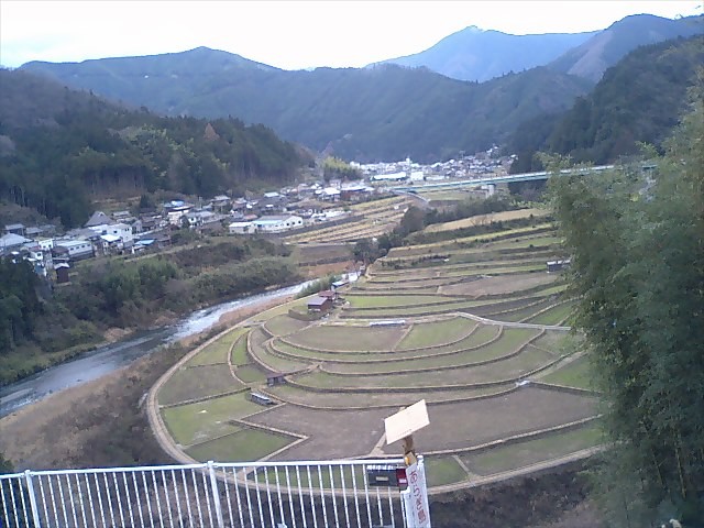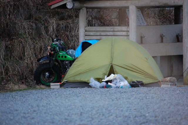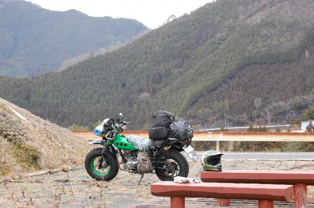 連休、本来の冬らしい気候に戻るって予報だったので、懐にハクキンを三つ放り込んで、 午前9時過ぎ、自宅をしゅっぱぁ~つ! 今回は実に久し振りのソロツーリング^^ すいすいすい~とちょっと突くと水がこぼれそうな空模様の大阪の町をブイブイいわせながら R309に入り、富田林の道の駅「かなん」で遅めの朝食。 この「かなん」は手つくりのパン屋さんがあり、和歌山方面に行くときは絶好の朝食ポイントなんよ。 カレーパンと味噌カツサンドを頬張りながら大阪らしくない田舎の風景に 自然と頬も緩むってもんです^^ うぃ~まだ食い足りんな、とジャがとこんにゃくのおでんも買い食い。ここはおでんも売ってるので、 この季節は本当に嬉しい。 そのまま309からR24で和歌山県入り。 この頃になると空にも晴れ間が差してきてぽかぽか陽気。 R371手前のローソンでタバコ休憩。 そのままR371で紀伊の山に分け入っていく。 実に和歌山らしいくねくねのカーブをどっこいしょ~と走ると高野山到着~。 高野山の西に位置する。昔はここが高野山の入り口だったようです。 凄く古い建物なんだけど、圧倒されるような大きな建物で 出来た当時は相当な威厳を誇っていたんだろうなと思わせた。 この頃になると吹雪いてきて、道路の気温計はー2度。 あかん、手が限界や~とR480,花園あたりで休憩。 車の往来は全くなく、ただ風の音だけが聞える。誰もいやしねぇ。 ひとり、か。 でもバイクに乗って、ツーリングするようになって分かってる。 孤独にもさみしい孤独とそうじゃない孤独があるってことを。 深い谷底を見下ろしながら豪快に山間を割っていく紀州路らしいR480をひたすら南西へ。 一応、今晩の宿に、と目星を付けていた久野原河川キャンプ場を有田川沿いに見つけるが どうやら冬季営業閉鎖中らしい。 まぁ、まだ2時前だしそんな焦ることもないか、とそのまま西へ。 道の駅「しみず」でちょっと遅い昼飯。 とんかつ定食。 食堂の客は老夫婦と俺のみ。あかん、俺こういう雰囲気大好きw 人心地ついてから2時、今回の目的である「あらぎ島」到着。 あらぎ島は有田川沿いに広がる棚田で、丁度、川がぐるっとまわりこんだ形に沿っているので、 自然と扇状になってる。 これが本当に綺麗な景観で、とある雑誌で目にして以来、見たかった場所なんです^^ あ、ちなみに愛用の一眼レフの標準レンズが壊れてドック入りすることになったので、 しばらく写真は望遠レンズと携帯カメラになりますのでw うぅ、、、、 異様にしょぼい展望所に?を感じつつも、さて今夜の宿は、と マップルを広げると、 おっ、近くに生石高原ありますやん!!去年の夏に行ったなぁ。 あそこは確か無料のキャンプ場があったはず、と俺はそのままr180で生石高原に向かった。 が、r180が工事中でr19で迂回ヨロ♪の看板が。 しょうがなく山を回りこむように北へ進路を変える。 この県道19、美里竜神線がねぇ。。。 道に苔、ガードレール無しの狭路、ブラインド多数という和歌山の山道は、、、、、、とよく言われる 見本の様な道でね。 うぅ~早くしないと日が暮れるよ~と言いながらもペースは上がらず淡々と進み、午後三時半、ようやく R370に復帰。うぅ、、、、人が、人がいるよwww 生石高原のキャンプ場は全く何も施設もないとこなんで、買出し必須なんだけど ほにゃらら商店という営業してるのかしてないのか分からない店ばっかりでスーパーがない。 10キロほど走ってr10への分かれ道にやっとスーパー発見! 今夜と明日の食材を買い込み、サイドキャリアに搭載。 かなり前に作った自転車カゴだけど、こういう時は本当に役に立つ。 俺が施したカスタムの中でも、これだけは実用度120%全開でマジお勧め。 ついでにガスも補給してr180で生石高原山頂を目指す。 道路が工事中の為、やたらと荒れてたけどなんとか午後4時半、生石高原到着!! 辺りは360度の大パノラマで大阪湾から紀伊山脈まで見渡せる好展望に しばし見とれる。 高原はどうやら冬季は山の家自体が閉まってるようで、管理人もいません。 来たときに写真とってたおじさんが帰ると本当に一人っきりに。 なんだか風も強いし、暗くなってきたのでさっさと設営しよ~と したんだけど、生憎の強風でかなり設営にとまどる。 仕方なく、洗い場の建物の横に付けて、バイクの積載に使ってたコードを最大限活用し、 バンバンのフレームや、建物の柱、落ちてたコンクリートブロックなんかに結び付けて、 テントの強度をあげる作業に大分時間を取られた。 設営を終えて、さて夜飯じゃ~と買って来てたチゲ鍋をぐつぐつ煮込む。 テント内火気厳禁?でもそんなの関係ねぇ!!吹雪とるっちゅーに! ハフハフいいながら飯を平らげたらあとは、おとつい届いた山田深夜の新作で 眠くなるまで読書TIME。 風の音が煩いので耳栓。 完全に外との音を断つと、より本の世界に没頭出来ますなぁ。 午後10時過ぎ、瞼の重みに耐え切れず就寝~。 今回は用心のため、シュラフを二組用意してたので快眠で