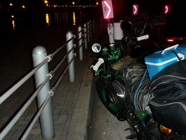あれはそう、岡山出張の早朝。 俺は恒例のランニングに出かけたんです。 そして。。。 まぁいいかw さてさて、土曜日。岡山出張帰り。つーか、最近岡山出張大杉クソワロタw 新幹線でピューと新大阪まで帰った俺は、そのまま駐車場のバン子に跨り自宅へ直行。 帰宅後、部屋の散らかりように阿鼻叫喚しつつ、部屋のお片付け。 昼寝をしたあと、午後3時過ぎから、いぜんから行きたかった、 自転車で嵐山遠征計画を実行。 木津嵐山自転車道はとにかく道が分かりにくいのが特徴の為、 紛らわしい分岐ポイントはネット上の写真をデジカメに収めておく。 あ、荷物を極力持ちたくない自転車ツーリングでは、地図をデジカメに分割して 映すように工夫したりしてますよ、ええ。 午後3時過ぎ、自宅を出発。 途中のコンビニでどら焼きを一個購入。 日が落ちるまでには、、、と懸命にペダリングした結果、結局、京都・嵐山までは5時杉に到着。 最近の筋トレの効果か、ノンストップでこれました。 あぁ~お腹すいたな、、、と店仕舞いを始めている出店の方へ行き、たこ焼きまだやってますかね?と たこ焼きみたいな頭をした俺がおばちゃんに聞くと、あいよぉ~あるで~と返事が返ってくる。 観光客でごった返す中、たこ焼きを小脇に抱えて、桂川堤防沿いに場所を移し、 ホクホクのたこ焼きをがっつく。 う~む、運動した音の粉モンはやべぇな、、、と大満足。 その後、桂川を見やりながら、タバコを一服という男のダンディズム体現タイムw すっかり、男時間を満喫した俺は、さて、帰りますかね、と 亀ちゃんに乗って大阪を目指す。 嵐山・渡月橋 亀 たこ焼きのコラボ 日が暮れる~ 家に帰ろう 途中、樟葉のGCでどら焼きをぱく付き当分補給し、8時前には自宅到着。 行きは2時間、帰りは2時間30分ってとこか。 とりあえずお尻の痛さが半端ないんですけどw ちわぁ~、今日、つーか昨日の夜ね。 以前からやりたいな~と思ってた釣りに行ってきました。 前回はバン子のパンクで無念のリタイヤ。 再び、元3-○LOTのvo&bの釣り仙人ことテーダバーたっ○んに弟子入りですw とりあえず俺のリクエストは、簡単に釣れて食べても美味しいやつ!ということで、 それならサビキだろってことで、大阪湾にサビキ釣りにレッツゴーってな話です。 22時に出発。夜の大阪の街をテーダブ、バン子のリア180mmコンビが時速60キロで駆け抜ける。 2時間ほどで現地の夢州到着。 地味に大阪港の夜景が綺麗でうっとり。 とりあえず、人生で一度も釣りなるものをやった事が無かった俺は 糸の通し方からリールの付け方仕掛けの付け方までレクチャーを受ける。 あとはドボンと海へ投げるだけです。 うっしゃー釣ったるでぇ~!とテンション高めで釣り開始です。 ・・・・・・・・・・・・・ 1時間、2時間、3時間。 時間だけが空しく経過していきます。 ヤバイデス、釣れる気配が全くございません。 隣のたっか○も苦笑いw 寒いのに薄着で着ていたため、がくぶる状態 そろそろ帰りたくなってきてる太郎w 釣り仙人・たっ○ん 結局、4時過ぎまで粘りましたが、デビュー戦は坊主でしたw 帰り支度をしている時に、いかにもなおっちゃんがやってきて、 アジならまだ早いわ。 5時すぎ位からやないと来ないでガハハハハ!と豪快に笑っておりました。 でも、とりとめのない話をしながら糸を垂らす時間を楽しむ。 俺、そんなんでええんですよ^^ あ、帰ってから案の定風邪ひきましたがねwww