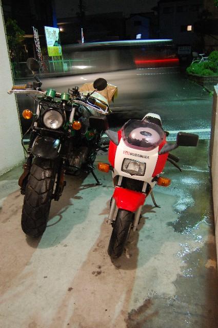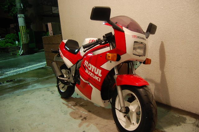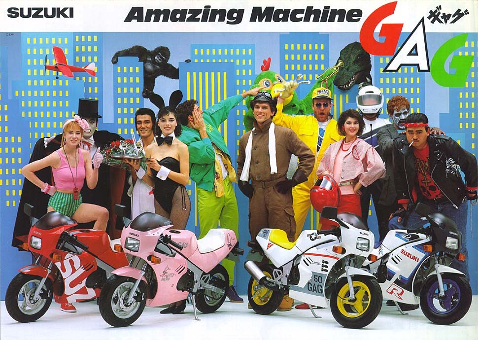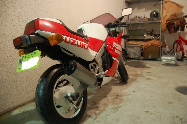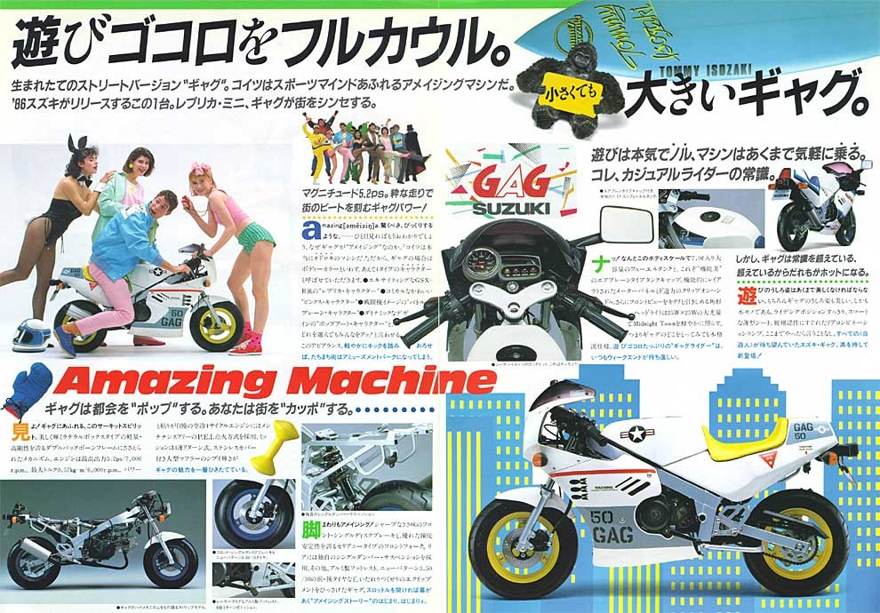 みたらシストこと太郎や~w さてさて、火曜日に待望の7年ぶりセカンドマシン、スズキのGAG〔ギャグ)が我が家に やってきました。 バイク屋の親Gがトランポに乗せて運んできまして、そのままガレージにて引渡し。 どこか分からない事あります?と訪ねる親Gに俺は「ン~、特にないっす、、、」と簡素な受け答え。 その辺をちょっと走ってみては?という親Gの誘いに、俺は「いや~あとで、、」と コミュ能力0ッぷりを遺憾なく発揮しつつ、親Gを帰路につかす事に成功w トランポの姿が見えなくなるのを確認するや俺はやっほ~いっ!とGAGに駆け寄り、 貰ったNOを取り付ける。 ん?原付なのに黄色ナンバーなのは何故かって? そこは大人の事情だよ君w空気よめ空気。 ナンバーを取り付けて早速、あちこちをじっくりと嘗め回すように鑑賞。 所々に小錆びはあるものの、年式を考えると充分に許容範囲。 オリジナル塗装は綺麗だし、カウルはやれも割れもなく程度良好。 一度、右側に転倒した事があるらしく、マフラー、バーエンドに路面とすれた箇所はあるが まぁ補修の範囲内っしょ。 タイヤは前後共に新品にして貰った為、安心。 エンジン掛かる状態での現状引渡しだった為、公道デビュー前に一通り整備開始です。 とりあえずエンジン掛けてみるかと、キック踏み込むと、一発で始動。 吹け上がりも特に問題なし。ノーマルマフラーですが、規制が緩かった当時のせいでしょうか? パンチの聞いた排気音です。キャブは開けんでも良さそうです。 で、まず、気になったのがドライブチェーン。ドロンとしたウンコみたいなグリスでネトネトダッタノデ、 全部洗い落とし、エンジンオイルで全コマクリクリ。 お次はクラッチ&アクセルのワイヤー&レバー注油。この辺は動きも渋くなく問題なし。 次にブレーキフルード交換したけど、色が茶色色で妙に粘度が高くやばかった。 茶色のフルードが出なくなるまでひたすら足して抜いての繰り返し。 そうそう、Bフルードのカバーとダイヤフラムはバンバンとまるで一緒でしただ。 欠品時はバンバンのが使えますよ、ええ。 あとはサイドスタンド付け根に注油し、とりあえず公道デビューの準備は完了。 その前に、車体を出来る限り磨き倒しました。 フレーム&スィングアームにある小錆は、あとでばらして塗りなおす事に決定。 カウルとかはワックス掛けると見違えるようにテカテカに。いいよいいよ~。 そんなわけで近くのガソリンスタンドまでひとっ走り。 シフトは若干ニュートラルに入りにくい気もするが慣れの問題かもしれません。 ウィンカーの点滅が、アイドリング時になるとしなくなるので、もしかしたらバッテリーが弱ってる 可能性大かも。とりあえずヤフオクで新品ポチっておきました。 だって¥2000とめちゃ安いんだものwついでにSMとPLもポチッとな。つか、パーツ出るんか?w 馬力は5.2馬力なんで遅いんですが前傾セパハン&低いシート高でスピード感が半端ないです。 30キロくらいしか出てないのにバンバンの70キロくらいの体感。 まぁ、長年バンバンに乗りなれた身なんで、徐々に慣れていく事でしょう。 今は怖くて60キロなんてとても出せませんよ、ええw 横から このアングルええなぁ 後ろから 太いサイレンサーと 10インチ幅3.5インチの太タイヤがいい感じ 前傾姿勢はそこまできつくない。 俺がチビ太だからってのは言いっこなしですw 誇らしげなヨシムラの文字。 ヨシムラと言えば巨人の吉村を真っ先に思い浮かべますが何か? 我が家の大黒柱、バン子とのツーショット じゃぁあとは若い2人に任せておいらは、、、w はい、それではファーストコンタクトのレポはこの辺にしときまして、 GAGそのものの情報も綴っておきましょう。 発売は1986年2月。 GSX-R風のフェアリングを纏ったレジャーバイクってな謳い文句で登場。 何を隠そう、50ccでは初のフルカウルバイクだったんです。 車名のとおり、SUZUKIが外見はレーサーぽいのに中身は劇遅という 半ばギャグで作られたマシン。 そんなスズキのギャグを真に受けたく、ホンダ&ヤマハは後を追うように NSR,TZRのゼロハンスポーツ車を発売。 ただこちらはミニマルサイズのGAGと違い、フルサイズ、 しかも2サイクルでとっても戦闘能力が高かった。 悲しいかな、当時は空前のレーサーブーム。速さ至上主義のユーザーはこぞって NSR,TZRの方へと流れていきます。 外見こそレーサールックなGAGでしたがいかんせん劇遅のため、あえなく、発売から 一年ちょっとで生産中止に。見事、不人気者のレッテルを貼られてしまいます。 それで、月日は流れに流れて現在。4サイクルミニの人気再燃で一部の根強い変態、いや熱心な ユーザーにその愛らしいフォルム共々愛されていると言うわけです。 とりあえずGAGさんこんにちわv(^^)v 発売当時のカタログ。 なんか色々と間違ってる気もしますが 嫌いじゃないんですよこういうのw 「 遊びゴコロをフルカウル 」 このキャッチだけで丼飯3杯はいけそうですw つーか、バンバンといい